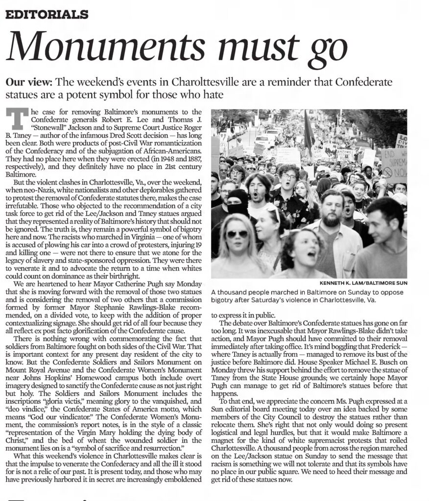 To that end, we appreciate the concern Ms. Pugh expressed at a Sun editorial board meeting today over an idea backed by some members of the City Council to destroy the statues rather than relocate them. She’s right that not only would doing so present logistical and legal hurdles, but that it would make Baltimore a magnet for the kind of white supremacist protests that rolled Charlottesville. A thousand people trom across the region marched on the Lee/Jackson statue on Sunday to send the message that racism is something we will not tolerate and that its symbols have no place in our public square. We need to heed their message and get rid of these statues now.