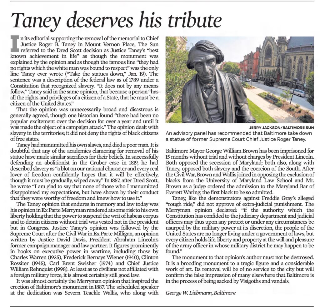 In its editorial supporting the removal of the memorial to Chief Justice Roger B. Taney in Mount Vernon Place, The Sun referred to the Dred Scott decision as Justice Taney’s “best known achievement in life” as though the monument was explained by the opinion and as though the famous line “they had no rights which the white man was bound to respect” was the only line Taney ever wrote (“Take the statues down, Jan, 19). The sentence was a description of the federal law as of 1789 under a Constitution that recognized slavery. “It does not by any means follow,” Taney said in the same opinion, that because a person “has all the rights and privileges of a citizen of a State, that he must be a citizen of the United States.”