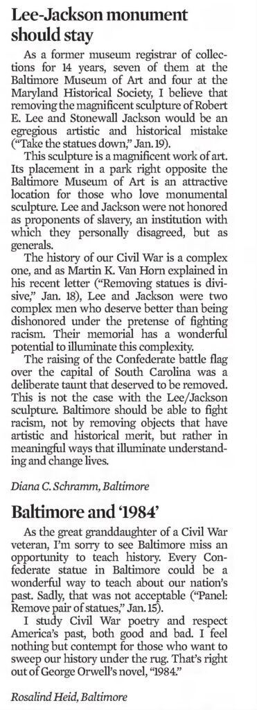 As the great granddaughter of a Civil War veteran, I’m sorry to see Baltimore miss an opportunity to teach history. Every Confederate statue in Baltimore could be a wonderful way to teach about our nation’s past. Sadly, that was not acceptable (‘Panel: Remove pair of statues,” Jan. 15).