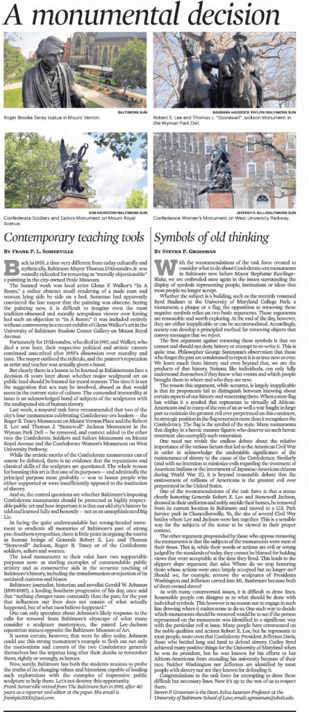 With the recommendations of the task force created to consider what to do about Confederate-era monuments in Baltimore now before Mayor Stephanie Rawlings- Blake, we are embroiled once again in the issues surrounding the display of symbols representing people, institutions or ideas that most people no longer accept.