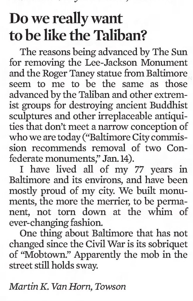 The reasons being advanced by The Sun for removing the Lee-Jackson Monument and the Roger Taney statue from Baltimore seem to me to be the same as those advanced by the Taliban and other extremist groups for destroying ancient Buddhist sculptures and other irreplaceable antiquities that don’t meet a narrow conception of who we are today (“Baltimore City commission recommends removal of two Confederate monuments,, Jan. 14).