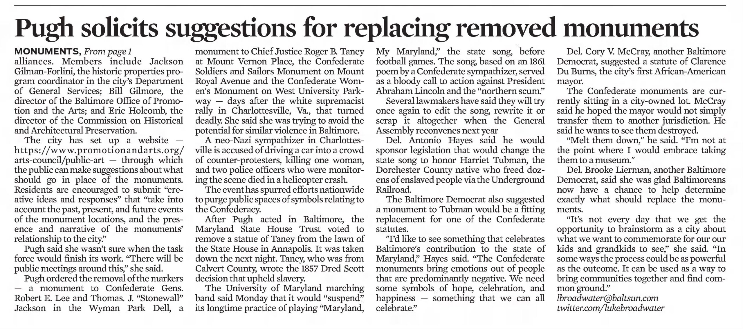 Del. Brooke Lierman, another Baltimore Democrat, said she was glad Baltimoreans now have a chance to help determine exactly what should replace the monuments.