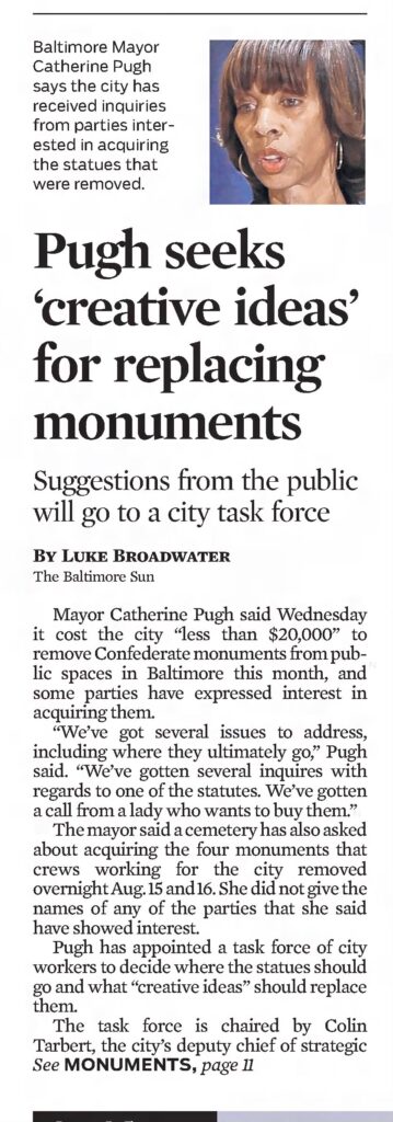 “We’ve got several issues to address, including where they ultimately go,” Pugh said. “We’ve gotten several inquires with regards to one of the statutes. We’ve gotten a call from a lady who wants to buy them.” The mayor said a cemetery has also asked about acquiring the four monuments that crews working for the city removed overnight Aug. 15 and 16. She did not give the names of any of the parties that she said have showed interest.