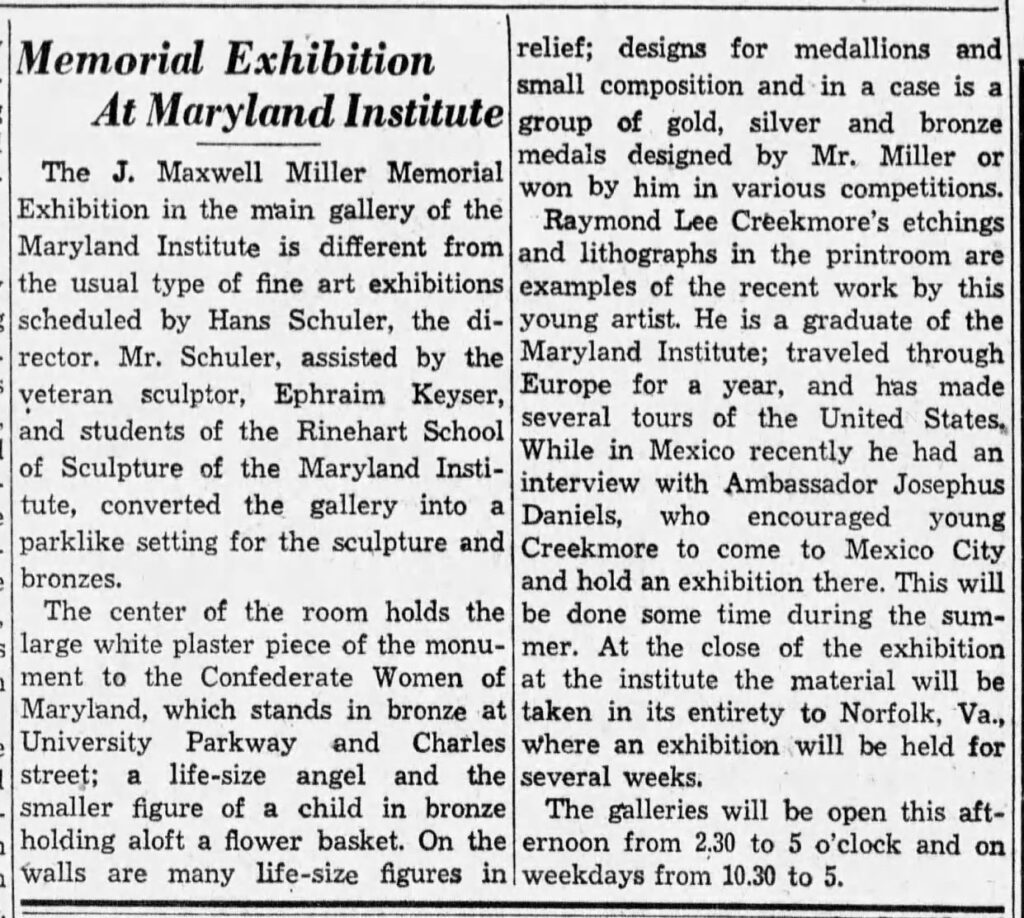 Raymond Lee Creekmore’s etchings and lithographs in the printroom are examples of the recent work by this young artist. He is a graduate of the Maryland Institute; traveled through Europe for a year, and has made several tours of the United States, While in Mexico recently he had an interview with Ambassador Josephus Daniels, who encouraged young Creekmore to come to Mexico City and hold an exhibition there. This will be done some time during the sum-mer. At the close of the exhibition at the institute the material will be taken in its entirety to Norfolk, Va., where an exhibition will be held for several weeks.