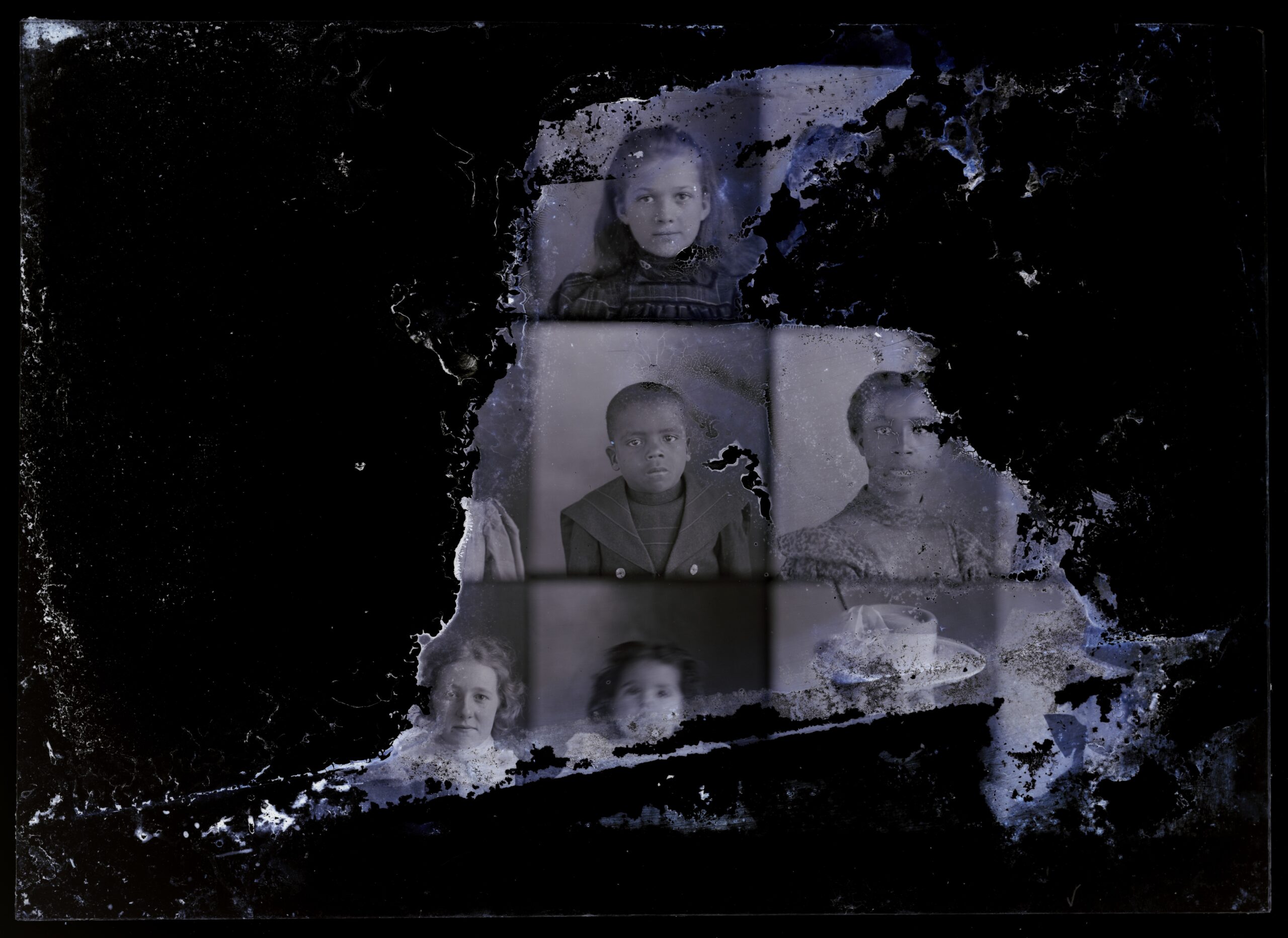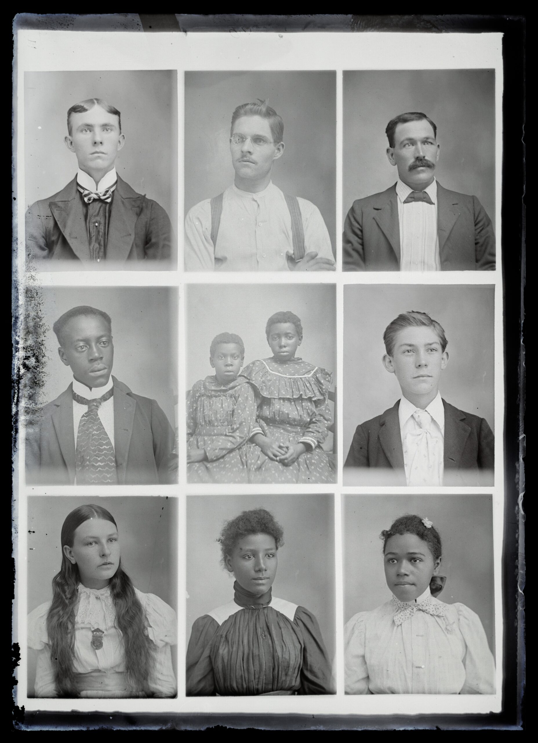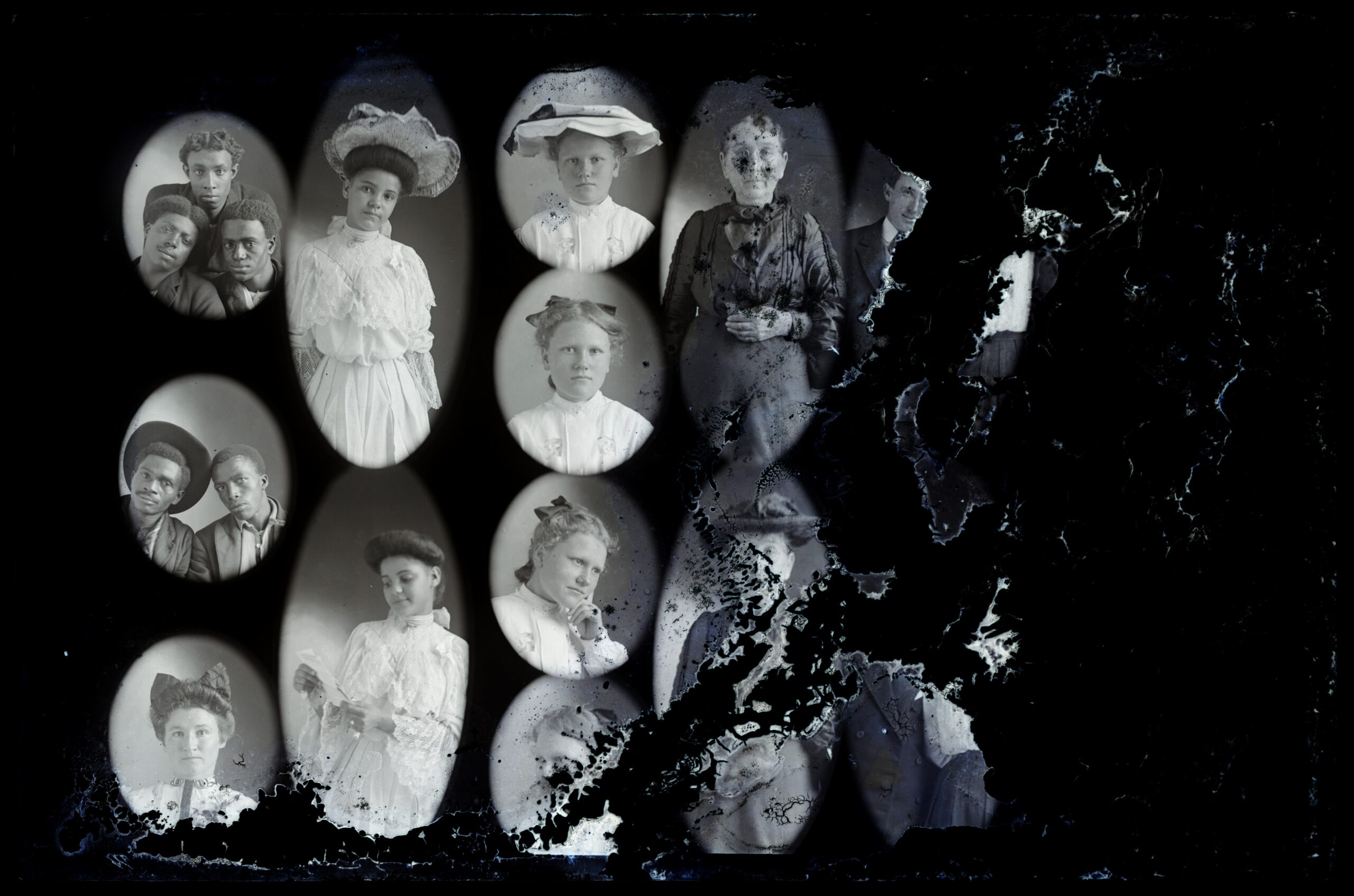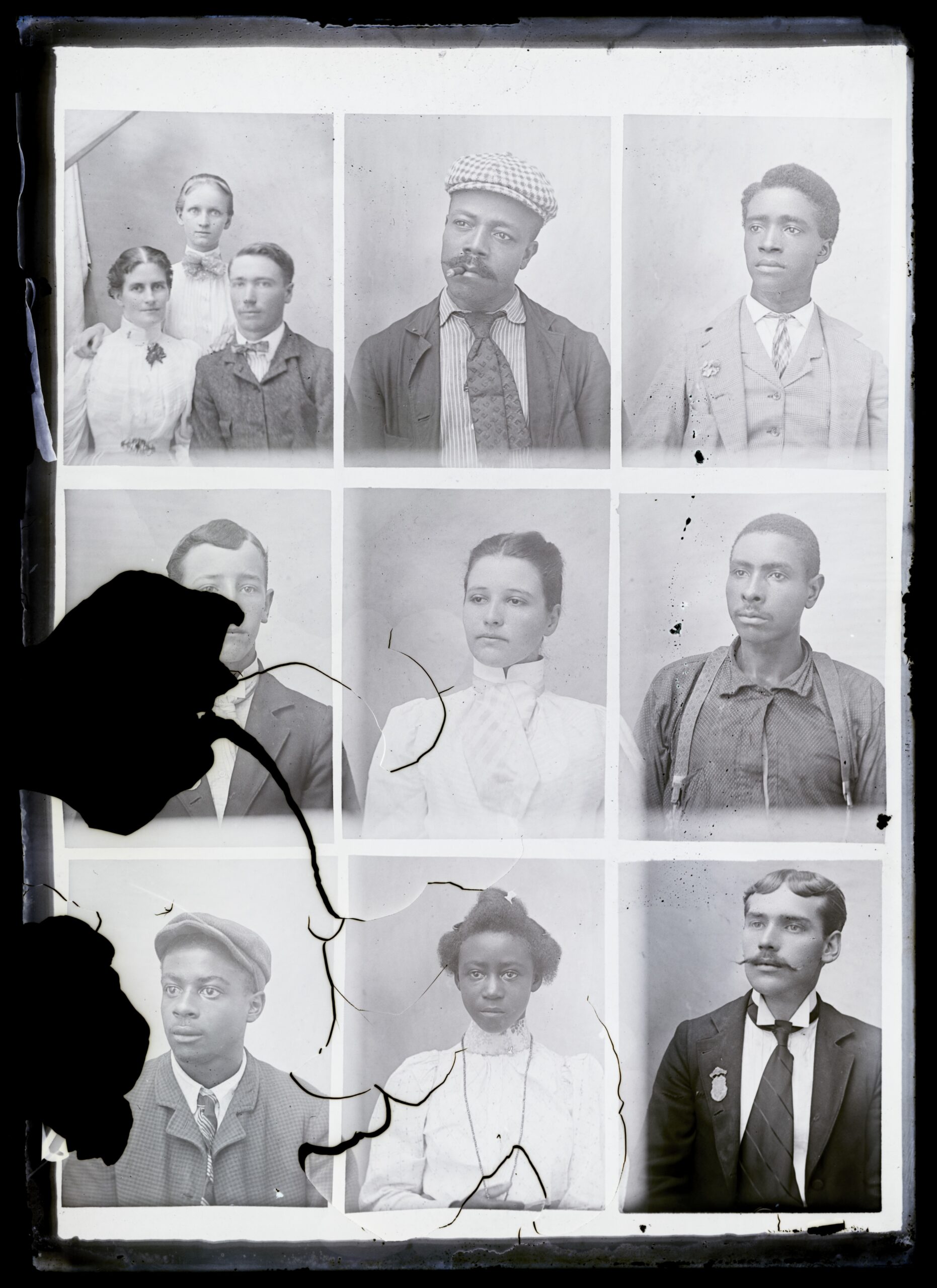 The revelation of Mangum’s photographs is startling and poignant. Only thirty-five years after the Civil War, as monuments to Confederate leaders and soldiers were proliferating across the South and Jim Crow segregation began to mark every aspect of American commercial and civic life, Mangum, who was white, photographed white and Black sitters equally. His contact sheets separate white and Black patrons by the slightest of margins, bringing together people who were otherwise kept apart in public spaces, a radical departure from the legalized discrimination of the period. Mangum also reused his glass plates, resulting in double exposures with ghostly figures, sometimes combining Black and white sitters on the same plate. The degradation of the negatives over time lends a further haunting abstraction to this social reality.