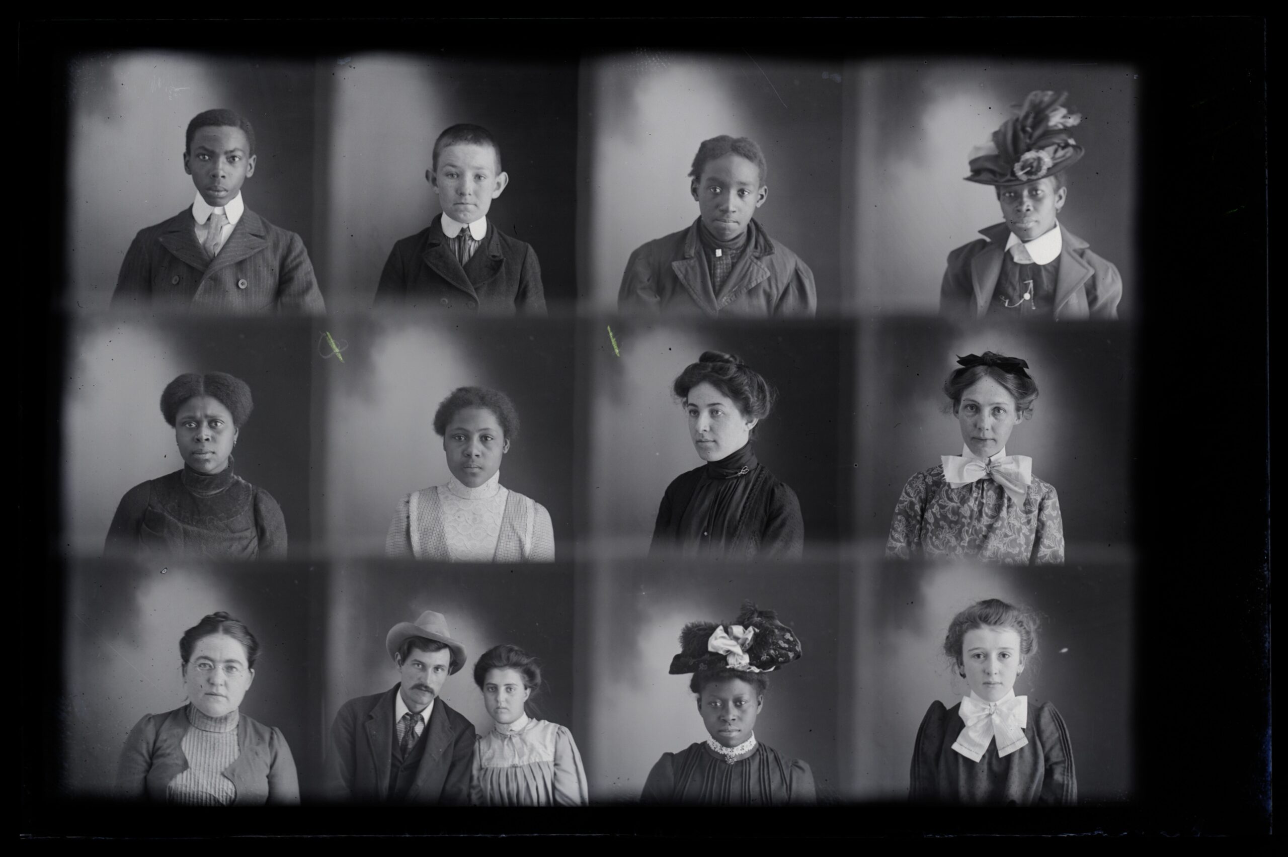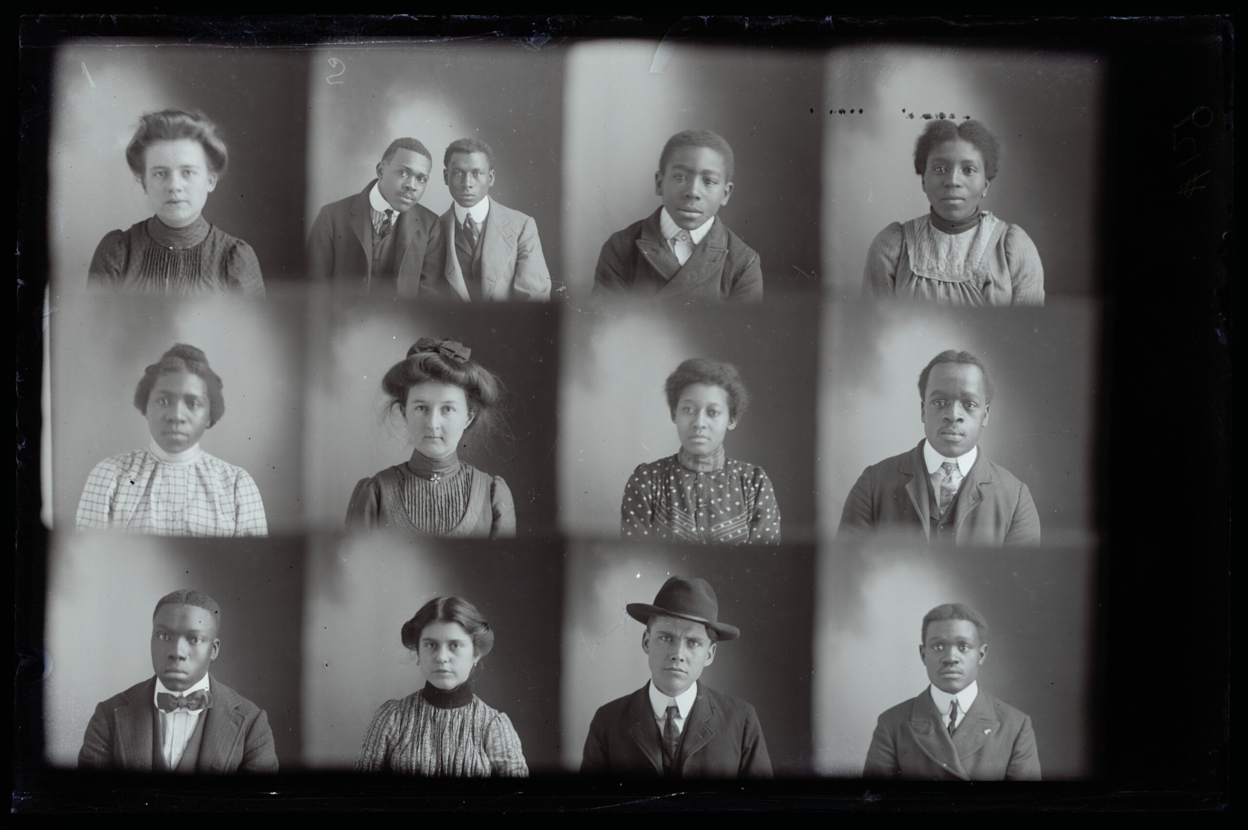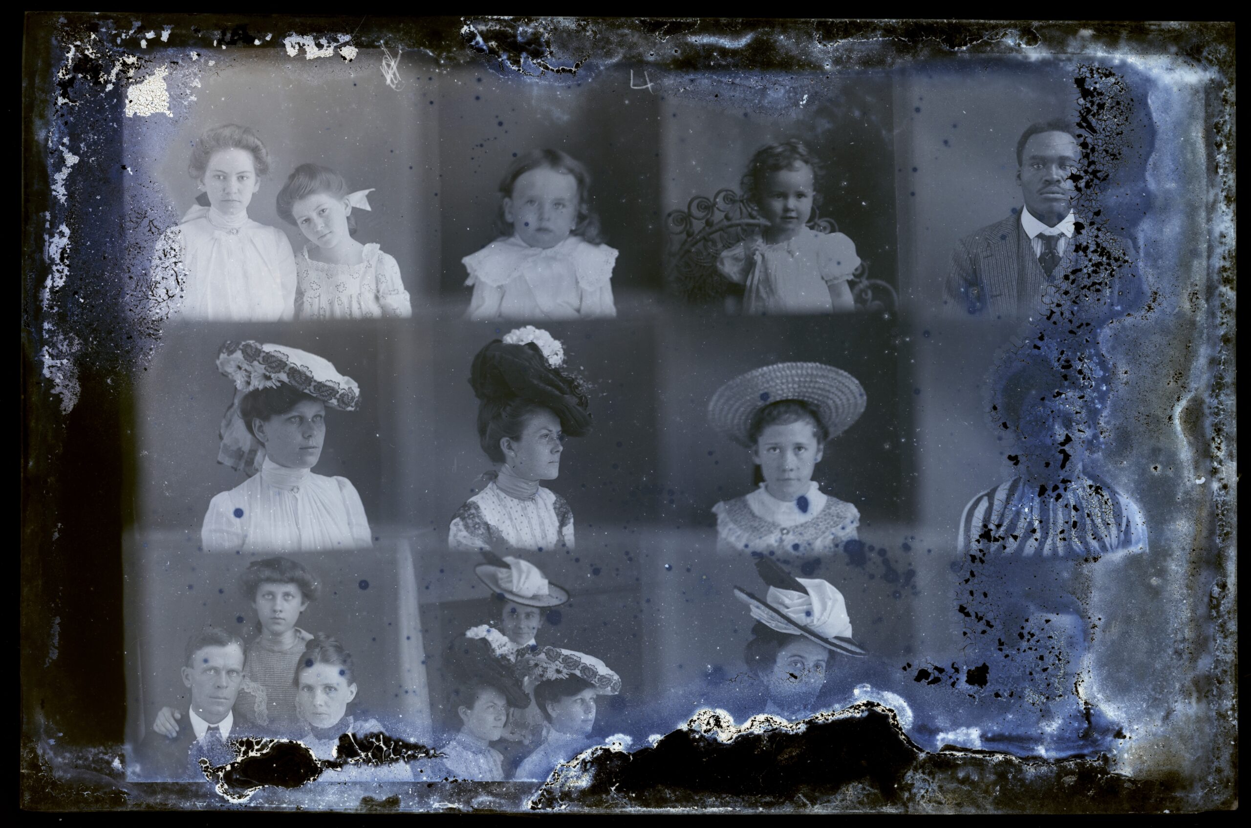 The revelation of Mangum’s photographs is startling and poignant. Only thirty-five years after the Civil War, as monuments to Confederate leaders and soldiers were proliferating across the South and Jim Crow segregation began to mark every aspect of American commercial and civic life, Mangum, who was white, photographed white and Black sitters equally. His contact sheets separate white and Black patrons by the slightest of margins, bringing together people who were otherwise kept apart in public spaces, a radical departure from the legalized discrimination of the period. Mangum also reused his glass plates, resulting in double exposures with ghostly figures, sometimes combining Black and white sitters on the same plate. The degradation of the negatives over time lends a further haunting abstraction to this social reality.