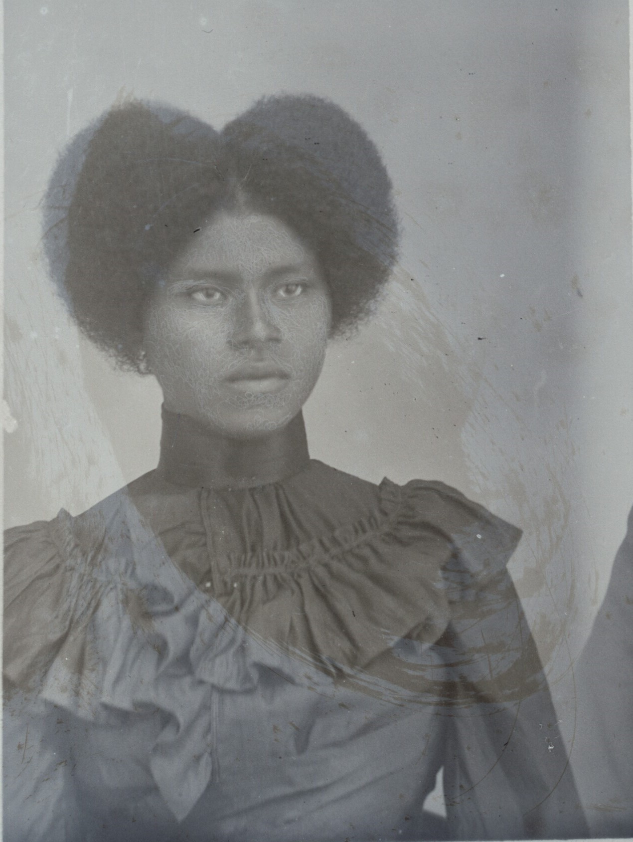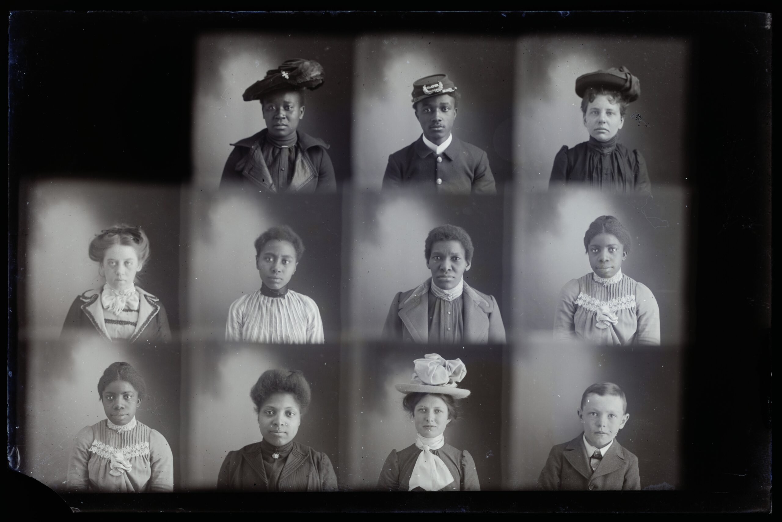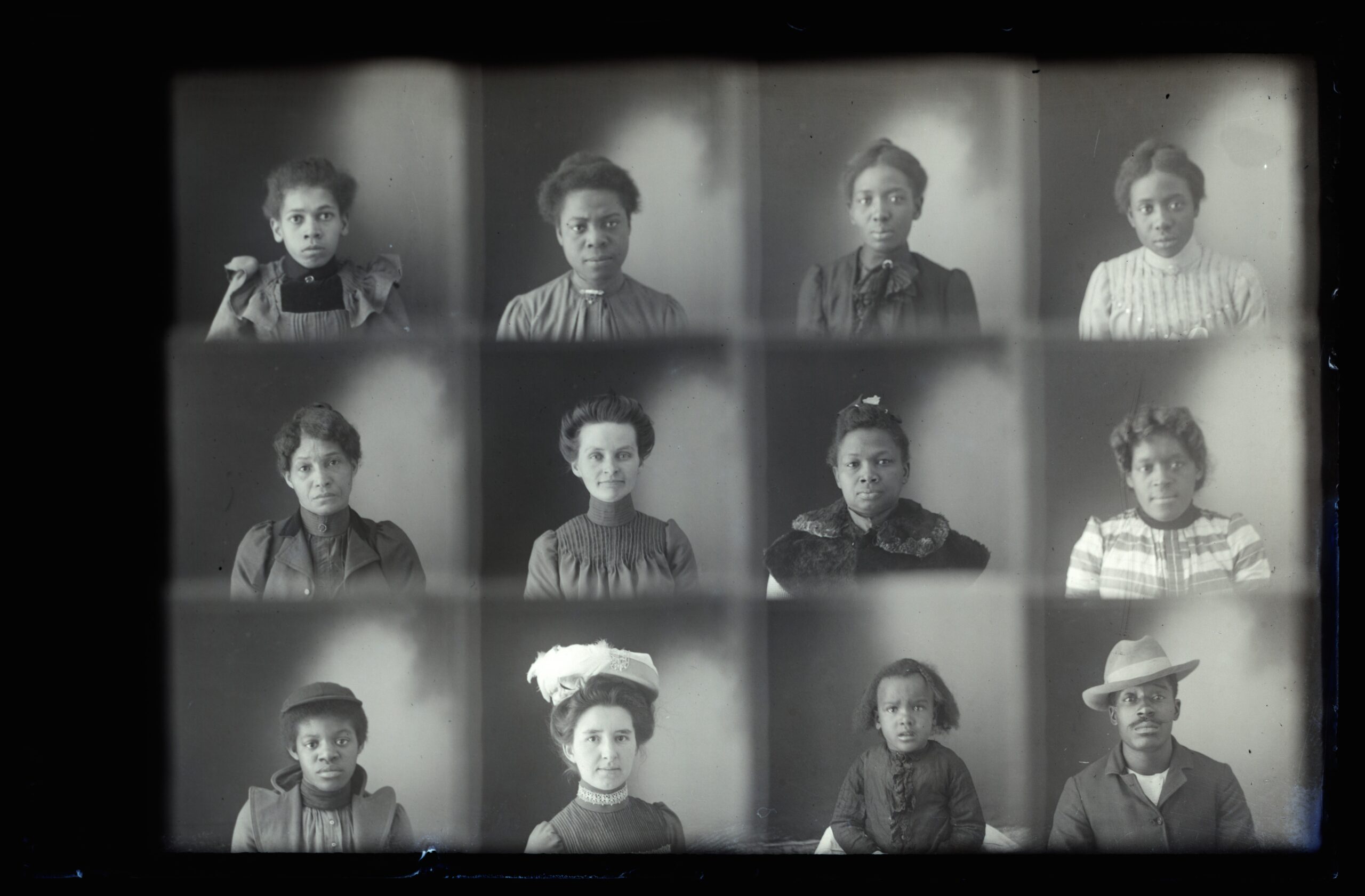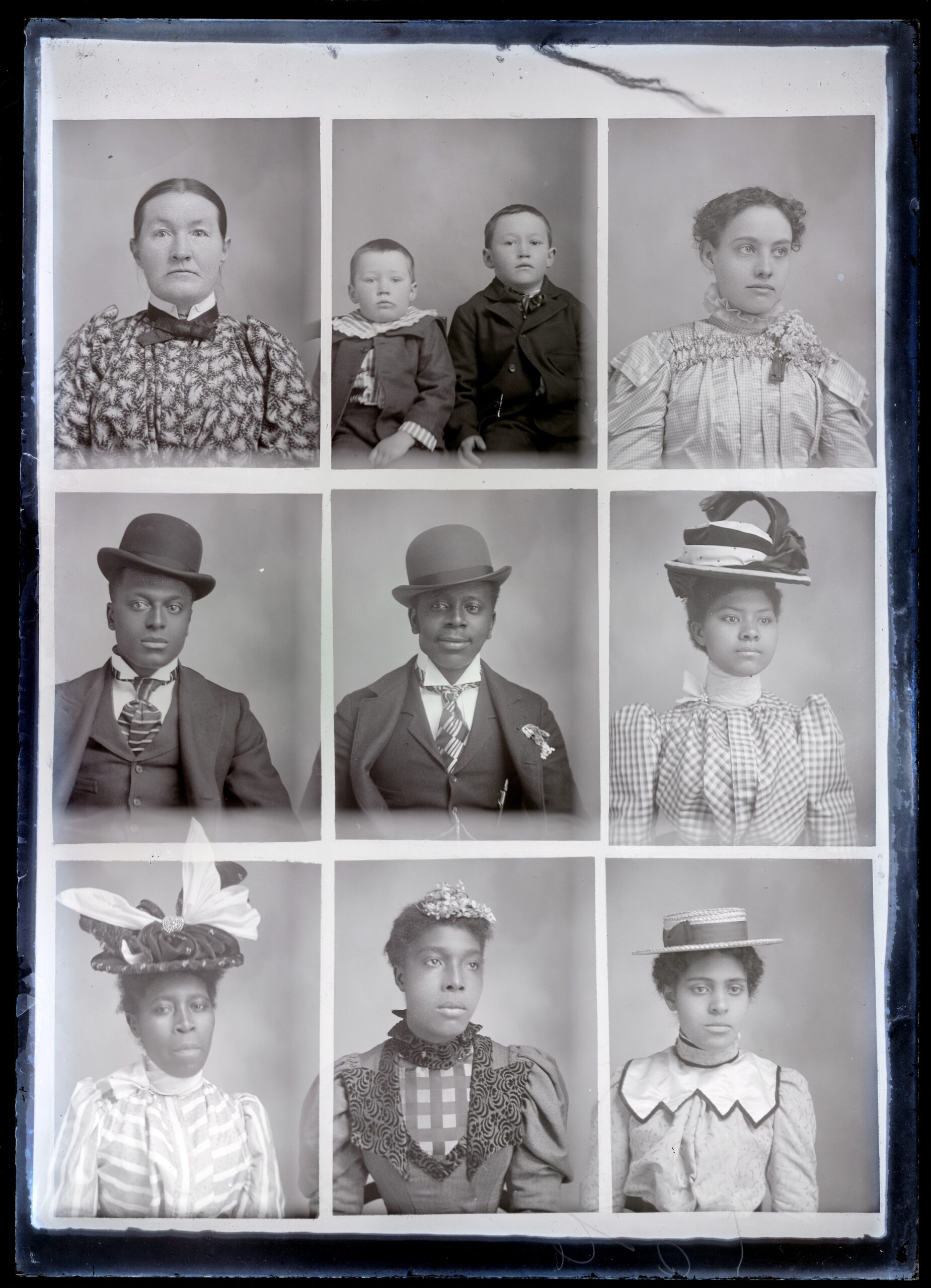 The revelation of Mangum’s photographs is startling and poignant. Only thirty-five years after the Civil War, as monuments to Confederate leaders and soldiers were proliferating across the South and Jim Crow segregation began to mark every aspect of American commercial and civic life, Mangum, who was white, photographed white and Black sitters equally. His contact sheets separate white and Black patrons by the slightest of margins, bringing together people who were otherwise kept apart in public spaces, a radical departure from the legalized discrimination of the period. Mangum also reused his glass plates, resulting in double exposures with ghostly figures, sometimes combining Black and white sitters on the same plate. The degradation of the negatives over time lends a further haunting abstraction to this social reality.