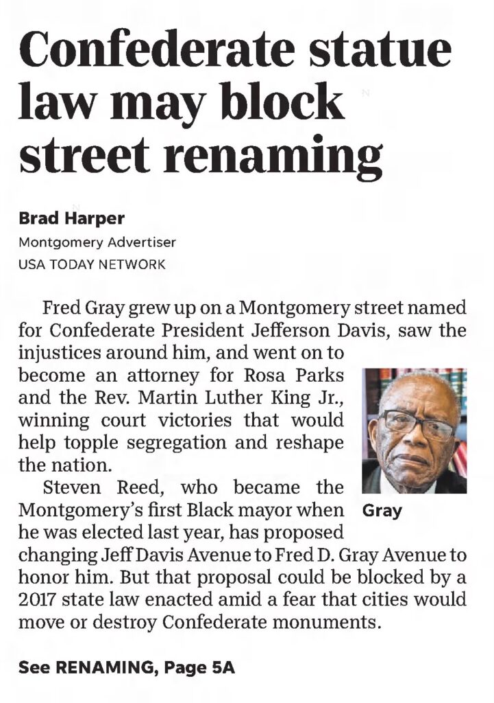 Steven Reed, who became the Montgomery’s first Black mayor when he was elected last year, has proposed changing Jeff Davis Avenue to Fred D. Gray Avenue to honor him. But that proposal could be blocked by a 2017 state law enacted amid a fear that cities would move or destroy Confederate monuments.