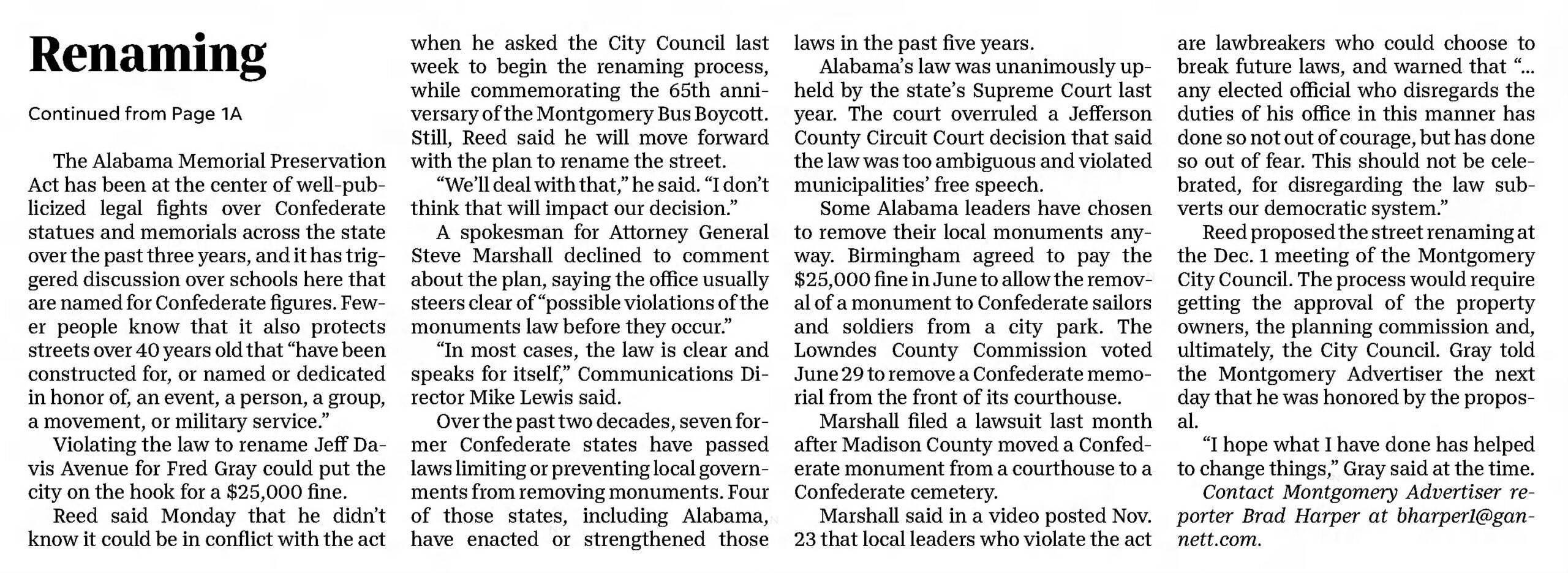 Reed proposed the street renaming at the Dec. 1 meeting of the Montgomery City Council. The process would require getting the approval of the property owners, the planning commission and, ultimately, the City Council. Gray told the Montgomery Advertiser the next day that he was honored by the proposal.