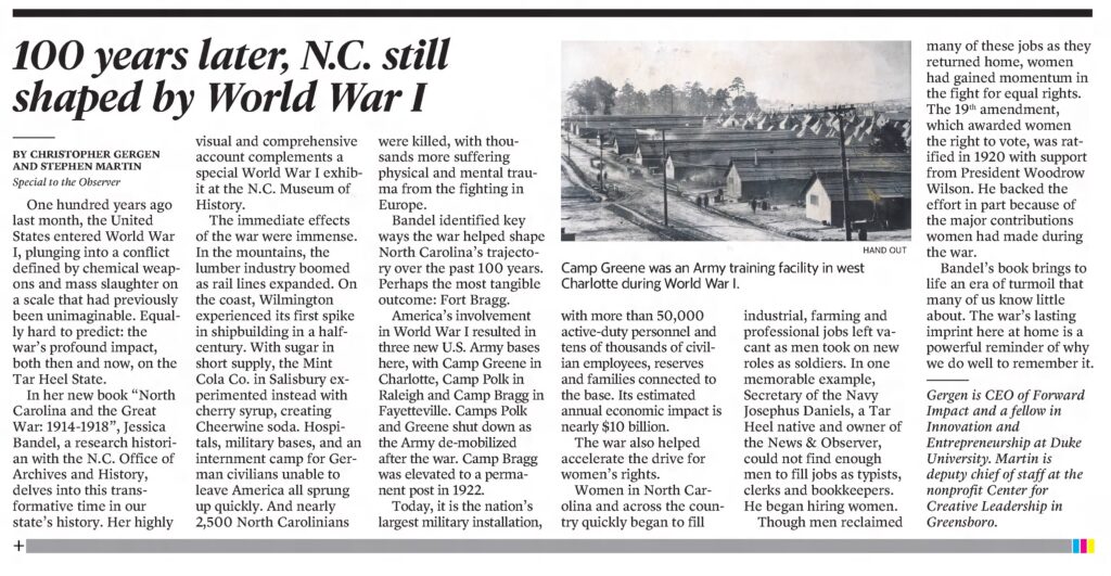 Bandel identified key ways the war helped shape North Carolina’s trajectory over the past 100 years. Perhaps the most tangible outcome: Fort Bragg.
