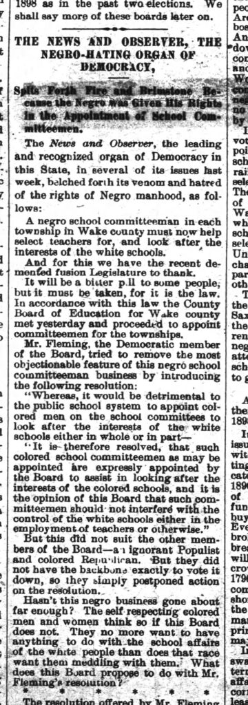 The News and Observer, the leading and recognized organ of Democracy in this State, in several of its issues last week, belched forth its venom and hatred of the rights of Negro manhood, as follows:
