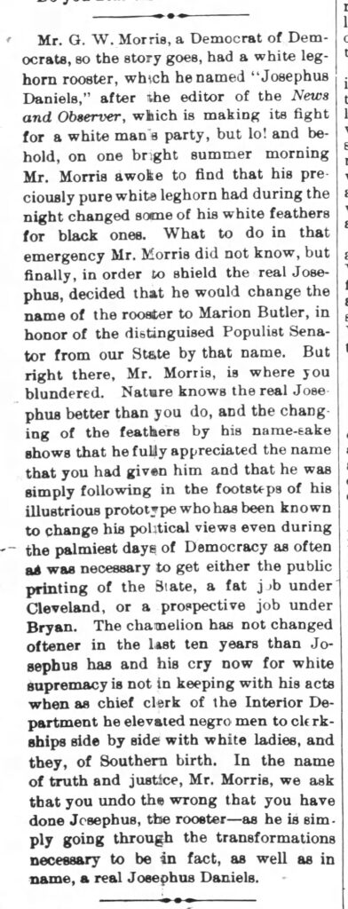 Mr. G. W. Morris, a Democrat of Democrats, so the story goes, had a white leghorn rooster, which he named “Josephus Daniels,” after the editor of the News and Observer, which is making its fight for a white man’s party, but lo! and be-hold, on one bright summer morning Mr. Morris awoke to find that his preciously pure white leghorn had during the night changed some of his white feathers for black ones. What to do in that emergency Mr. Morris did not know, but finally, in order to shield the real Josephus, decided that he would change the name of the rooster to Marion Butler, in honor of the distinguished Populist Senator from our State by that name. But right there, Mr. Morris, is where you blundered. Nature knows the real Josephus better than you do, and the changing of the feathers by his name-sake shows that he fully appreciated the name that you had given him and that he was simply following in the footsteps of his illustrious prototype who has been known to change his political views even during the palmiest days of Democracy as often as was necessary to get either the public printing of the State, a fat job under Cleveland, or a prospective job under Bryan. The chamelion has not changed oftener in the last ten years than Josephus has and his cry now for white supremacy is not in keeping with his acts when as chief clerk of the Interior Department he elevated negro men to clerkships side by side with white ladies, and they, of Southern birth. In the name of truth and justice, Mr. Morris, we ask that you undo the wrong that you have done Josephus, the rooster – as he is simply going through the transformations necessary to be in fact, as well as in name, a real Josephus Daniels.