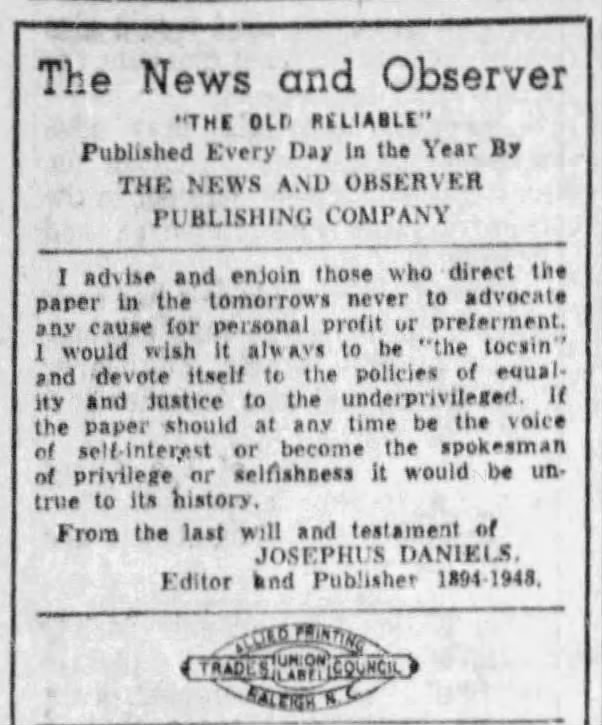 I advise and enjoin those who direct the paper in the tomorrows never to advocate and devote itself to the policies of equality and justice to the underprivileged. If the paper should at any time be the voice of self-interest or become the spokesman of privilege or selfishness it would be untrue to its history.