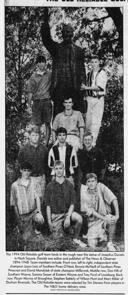 The 1994 Old Reliable golf team lands in the rough near the statue of Josephus Daniels in Nash Square. Daniels was editor and publisher of The News & Observer