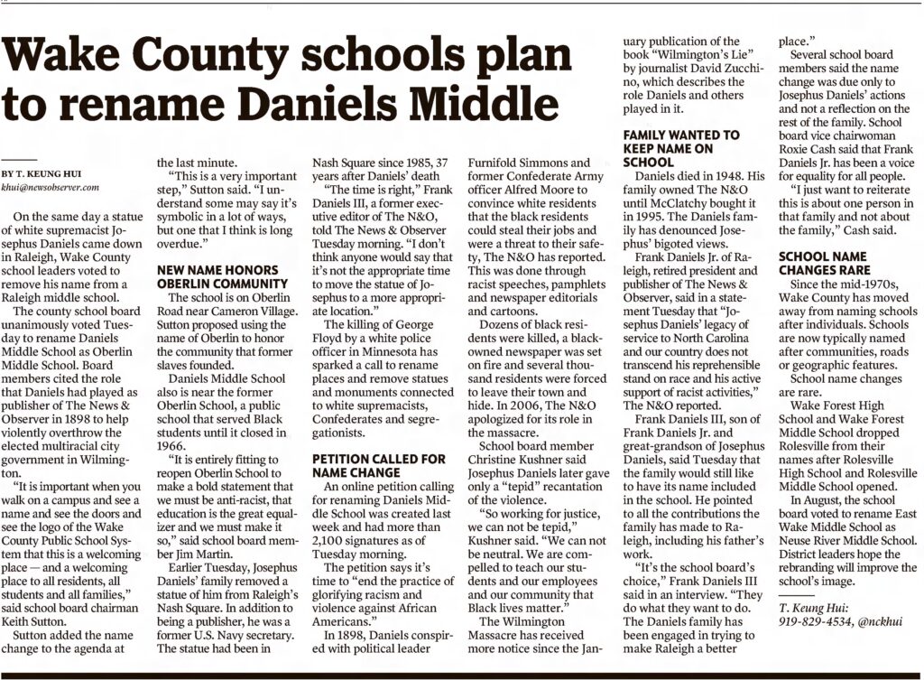 On the same day a statue of white supremacist Josephus Daniels came down in Raleigh, Wake County school leaders voted to remove his name from a Raleigh middle school.