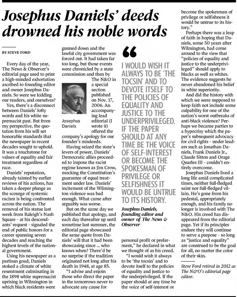Yes, there’s a disconnect between Daniels’ lofty words and his white supremacist past. But from my perspective, the quotation from his will set honorable standards that the newspaper in recent decades sought to uphold. It was a touchstone for values of equality and fair treatment regardless of race.