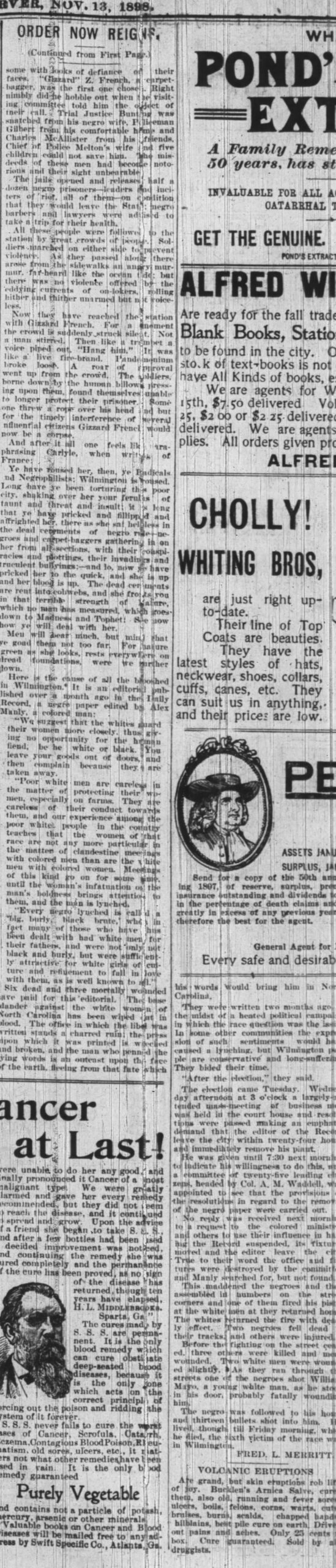 They were written two months ago the midst of a heated political campaign in which the race question was the issue. In some other communities the expression of such sentiments would have caused a lynching, but Wilmington people are conservative and long-suffering. They bided their time.
