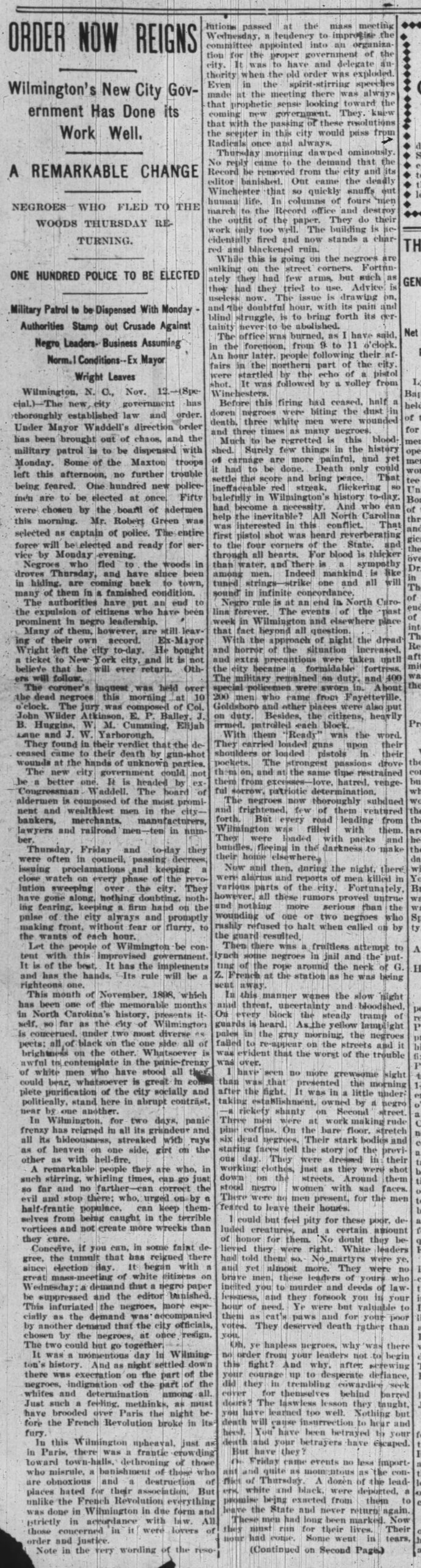 It was a momentous day in Wilmington history. And as night settled down there was execration on the part of the negroes, indignation of the part of the whites and determination among all. Just such a feeling, methinks, as must have brooded over Paris the night before the French Revolution broke in its fury.