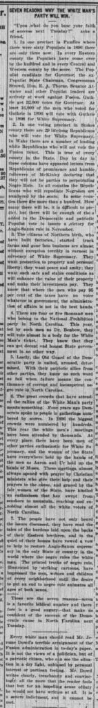 - In one voting precinct in Stokes county there are 20 lifelong Republicans who will vote for White Supremacy. In Wake there are a number of leading white Republicans who will not vote the Fusion ticket. This its true of every county in the State. Day by day in these columns have appeared letters from Republicans of prominence and humble followers of McKinley declaring that they will not be parties to perpetrating Negro Rule. In all counties the Republicans who will repudiate Negroism are numbered by the, score. In some counties there are more than a hundred. How many there will be, it is difficult to predict, but there will be enough of them added to the Democratic and patriotic Populist vote to insure a victory for Anglo-Saxon rule in November,