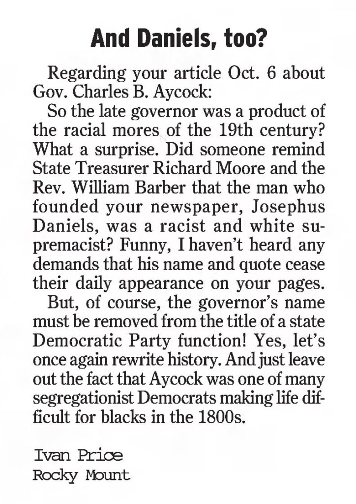 What a surprise. Did someone remind State Treasurer Richard Moore and the Rev. William Barber that the man who founded your newspaper, Josephus Daniels, was a racist and white supremacist? Funny, I haven’t heard any demands that his name and quote cease their daily appearance on your pages.