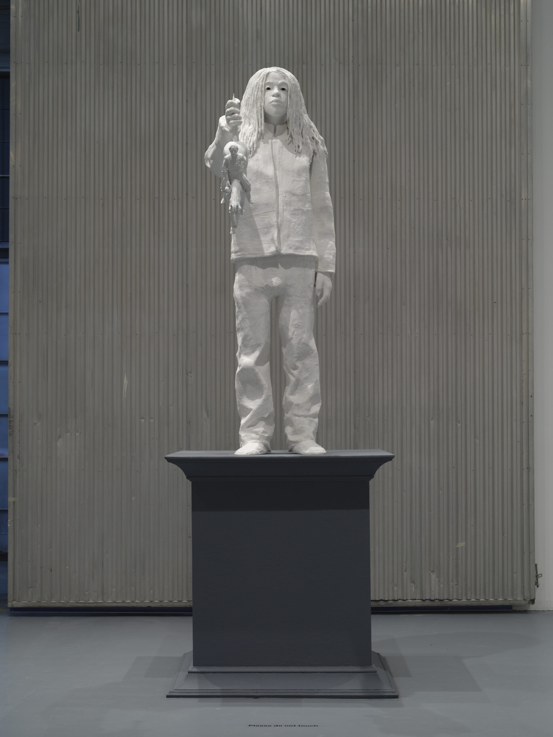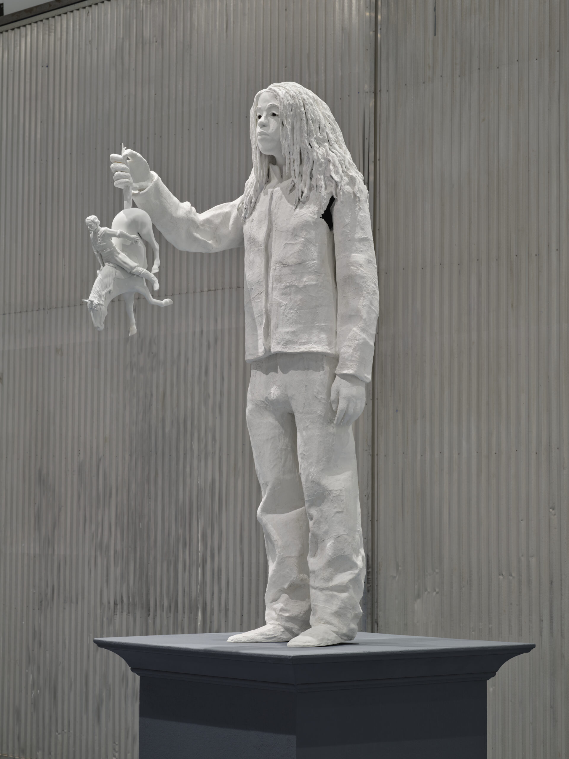 Davis’s choice to represent her own son speaks to the role of women in the proliferation of Lost Cause mythology beginning in the 1890s. Rather than ex-soldiers, women’s groups like the UDC were largely responsible for fundraising and commissioning statues honoring their Civil War heroes. Unlike the historic statues in the exhibition that have been removed from their pedestals, Moses stands on a plinth at monumental scale. Reminiscent of Charles Ray’s Boy with Frog (2009), Descendant depicts a thirteen-year-old Moses with one arm outstretched holding a two-foot tall replica of the Morgan statue, a placid expression on his face. With Descendant, Davis recalibrates her family tree, emphasizing Moses’s (re)clamation of the future over a mythological version of the past.
