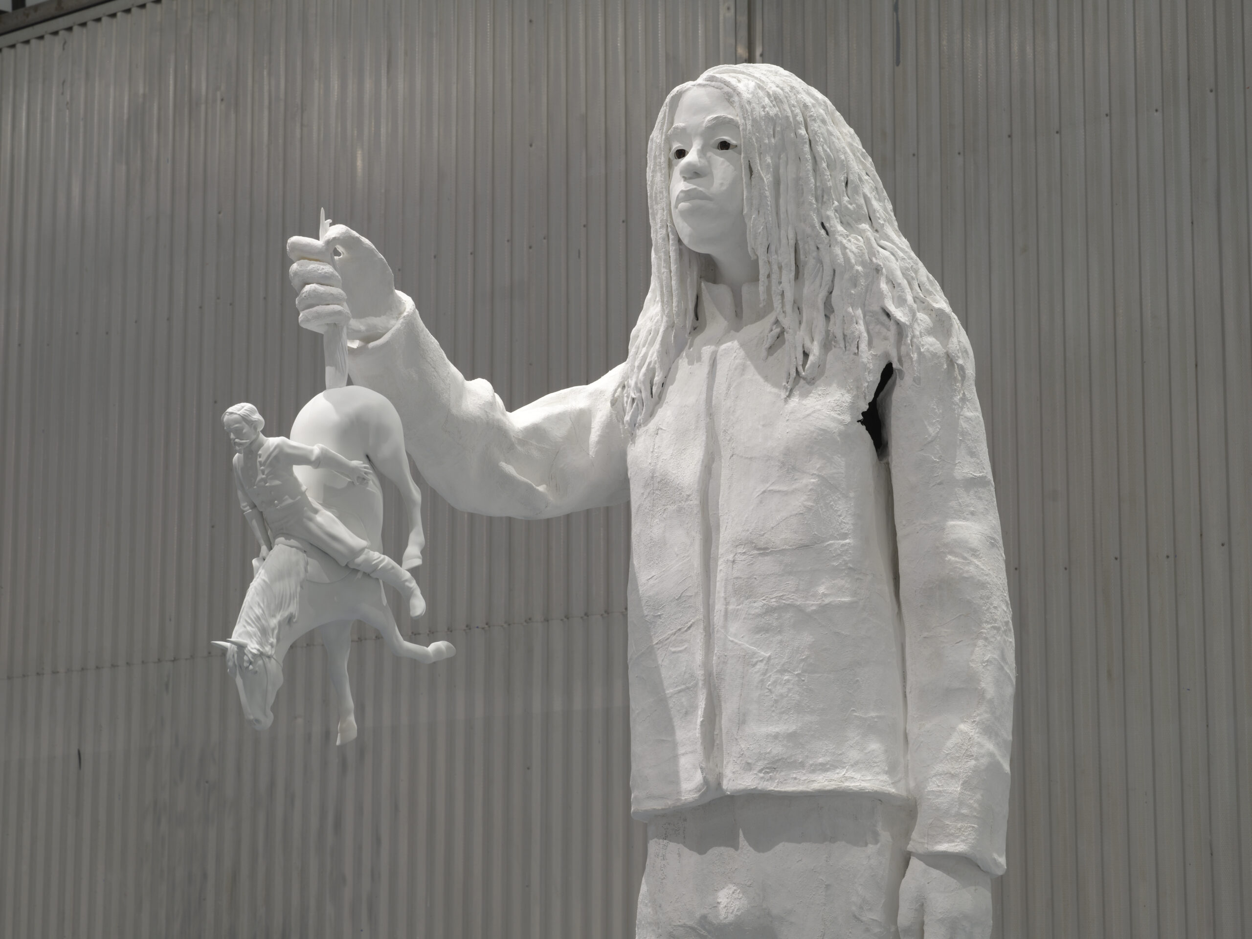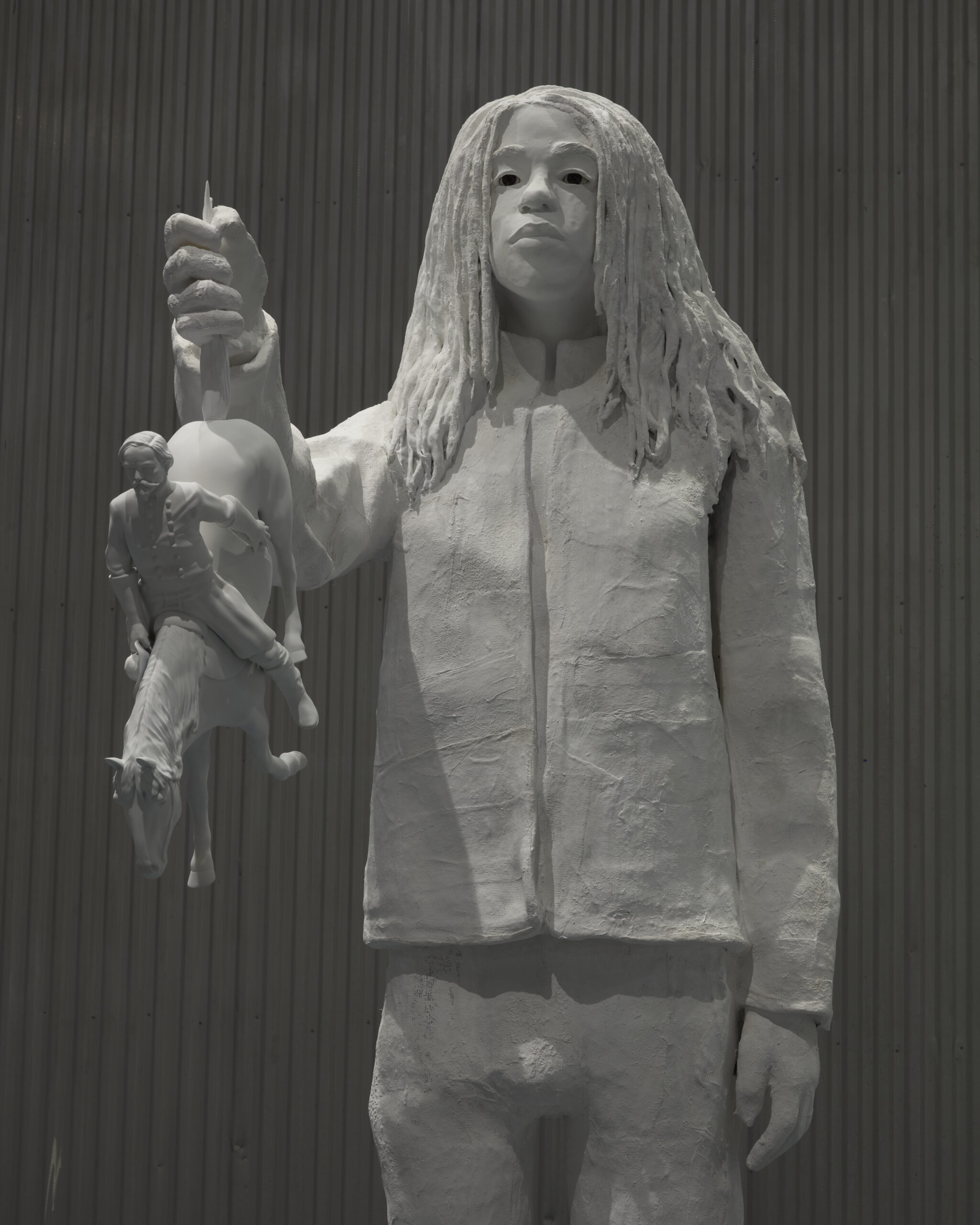 Descendant is a monumental portrait of the artist’s son Moses, who holds a miniature bronze replica of a statue of Confederate general John Hunt Morgan in his outstretched hand. Working from three-dimensional scans of a monument to Morgan that once stood in front of the Fayette County courthouse in Lexington, Kentucky, Davis shrinks his legacy, offering a powerful image that not only speaks to the contemporary moment but challenges Lost Cause ideology.
