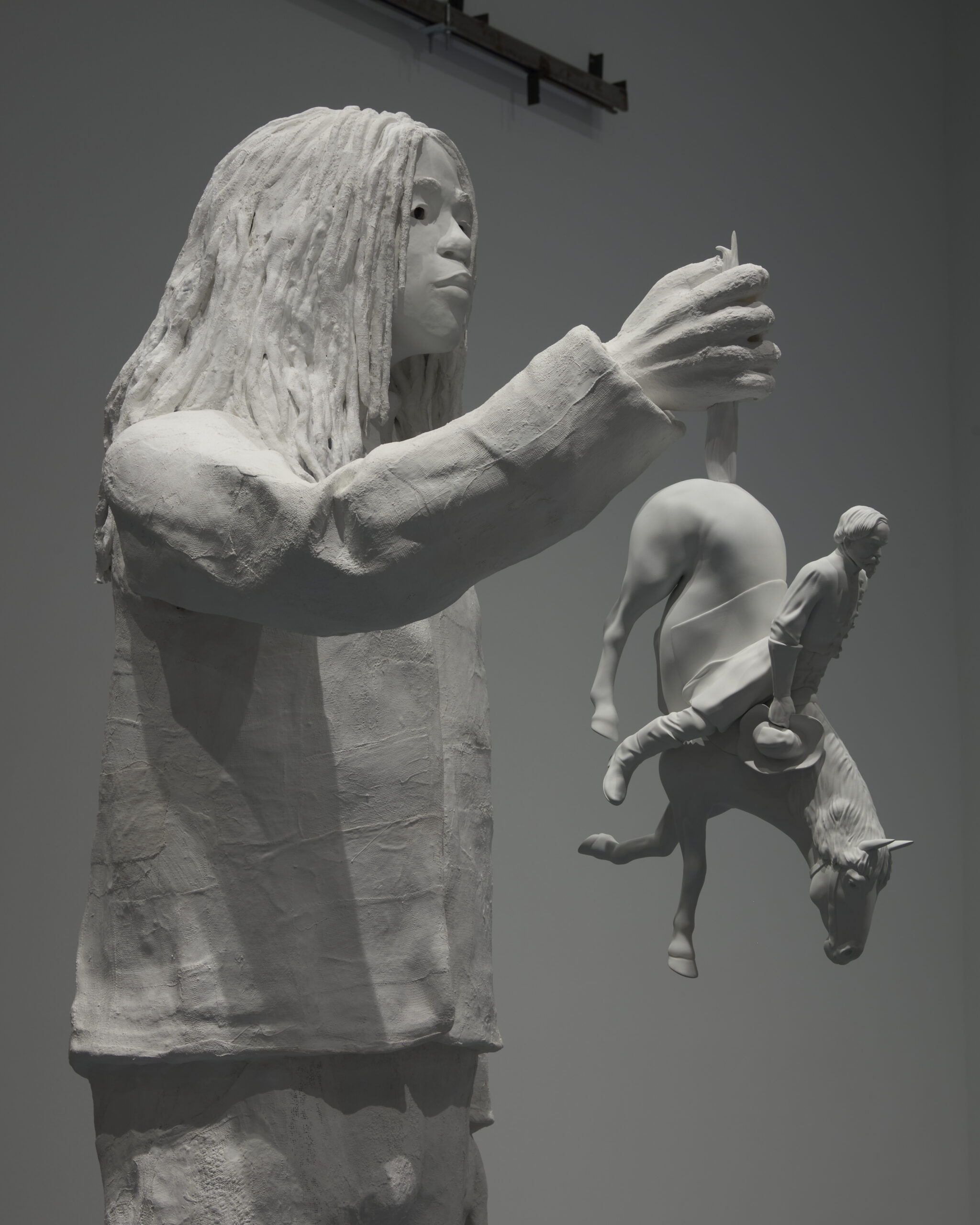 Davis is known for her use of plaster, making life-size casts of family and friends as well as her own body in a process akin to Egyptian mummification. As the artist describes: “It’s very ceremonial when I plaster cast. The wrapping of the body feels traditional to me, and when I’m doing my work, sometimes I feel like I’m capturing the person’s spirit or soul—or a portion of it. I’m capturing that moment in time.” Exemplifying her mastery of the cast plaster technique, Descendant extends Davis’s explorations of her own lived experiences as well as systemic social issues, including the history of racism and violence in America. Her cast plaster sculptures of historical and imaginary figures are often presented in arresting installations that recall cinematic scenes or stage performances, drawing upon her background in theater and film.