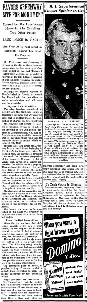 Mr. Howard said that the project has commanded the interest of eminent sculptors from all over the country, at least one of whom has been in Baltimore to confer with the committee.