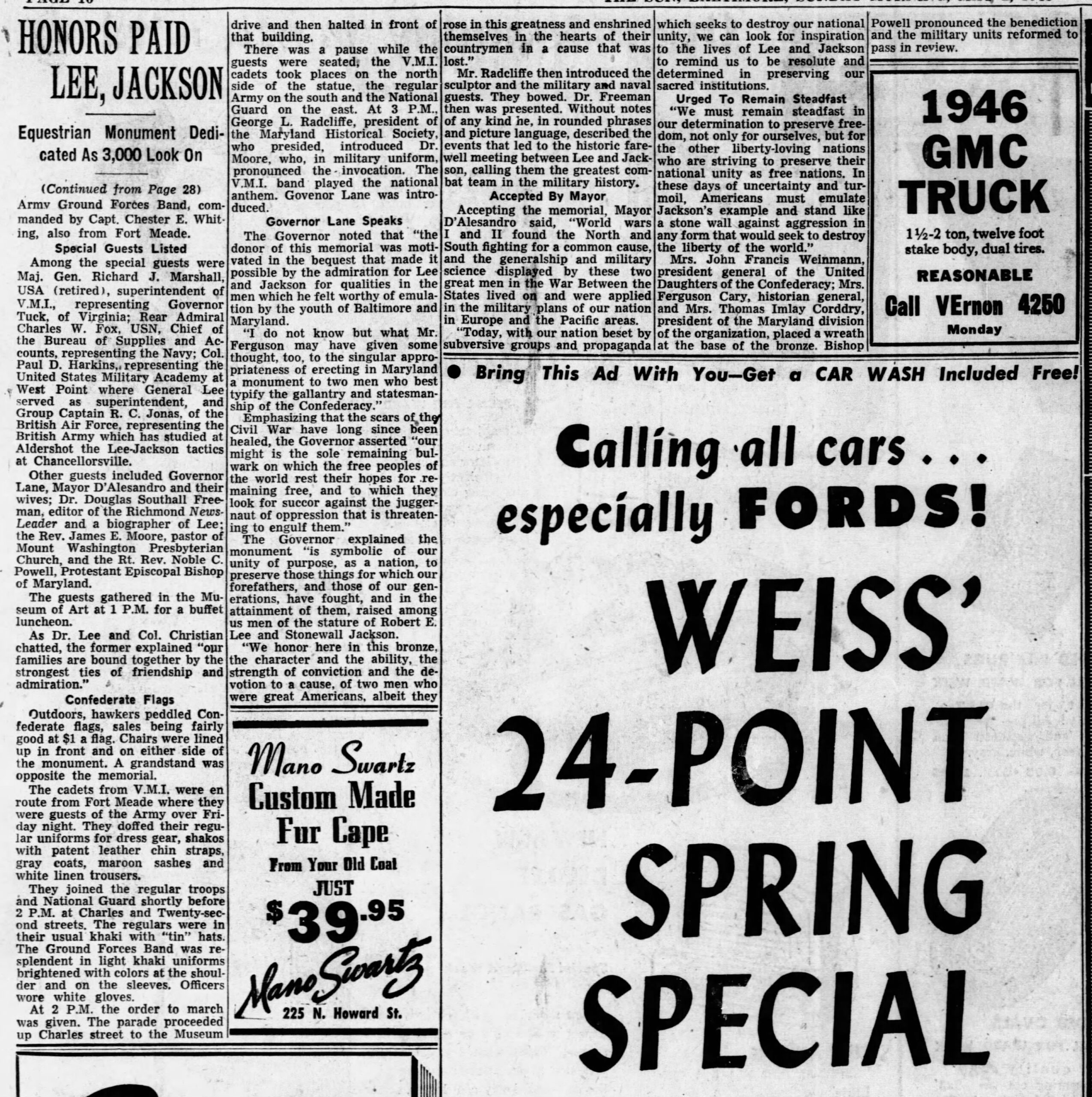 Accepting the memorial, Mayor D’Alesandro said, “World wars I and II found the North and South fighting for a common cause, and the generalship and military science displayed by these two great men in the War Between the States lived on and were applied in the military plans of our nation in Europe ad the Pacific areas.