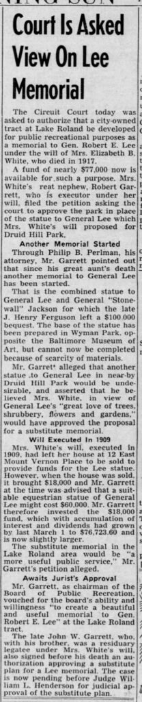 White’s great nephew, Robert Garrett, who is executor under her will, filed the petition asking the court to approve the park in place of the statue to General Lee which Mrs. White’s will proposed for Druid Hill Park.