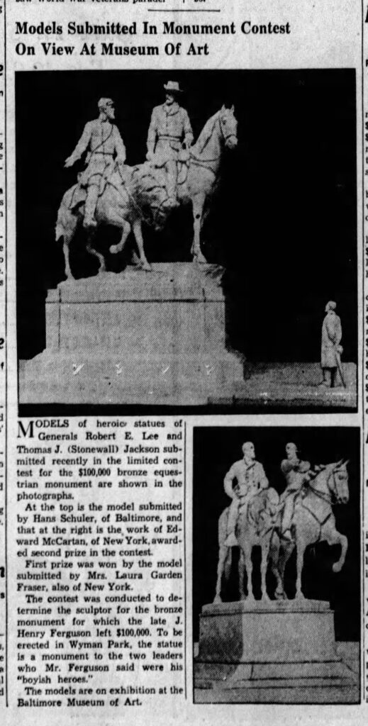 The contest was conducted to determine the sculptor for the bronze monument for which the late J. Henry Ferguson left $100,000. To be erected in Wyman Park, the statue is a monument to the two leaders who Mr. Ferguson said were his