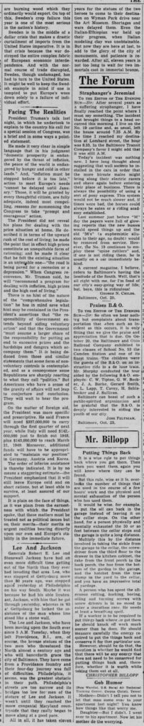 The Lee and Jackson, who have been moving upon the South ever since 5 A.M. Tuesday, when they left Providence, R.., are, of course, the bronze statues of the two men who threatened the North almost a century ago and who will henceforth grace the city of Baltimore. They have come from a Providence foundry and their four-day journey was full of difficulties. Philadelphia, it seems, was the greatest obstacle in their path. Philadelphia’s streets are too narrow and its bridges too low for/men of the stature of Lee and Jackson. It wasn’t until they reached the more congenial Maryland countryside that they really began to move along at a good pace.