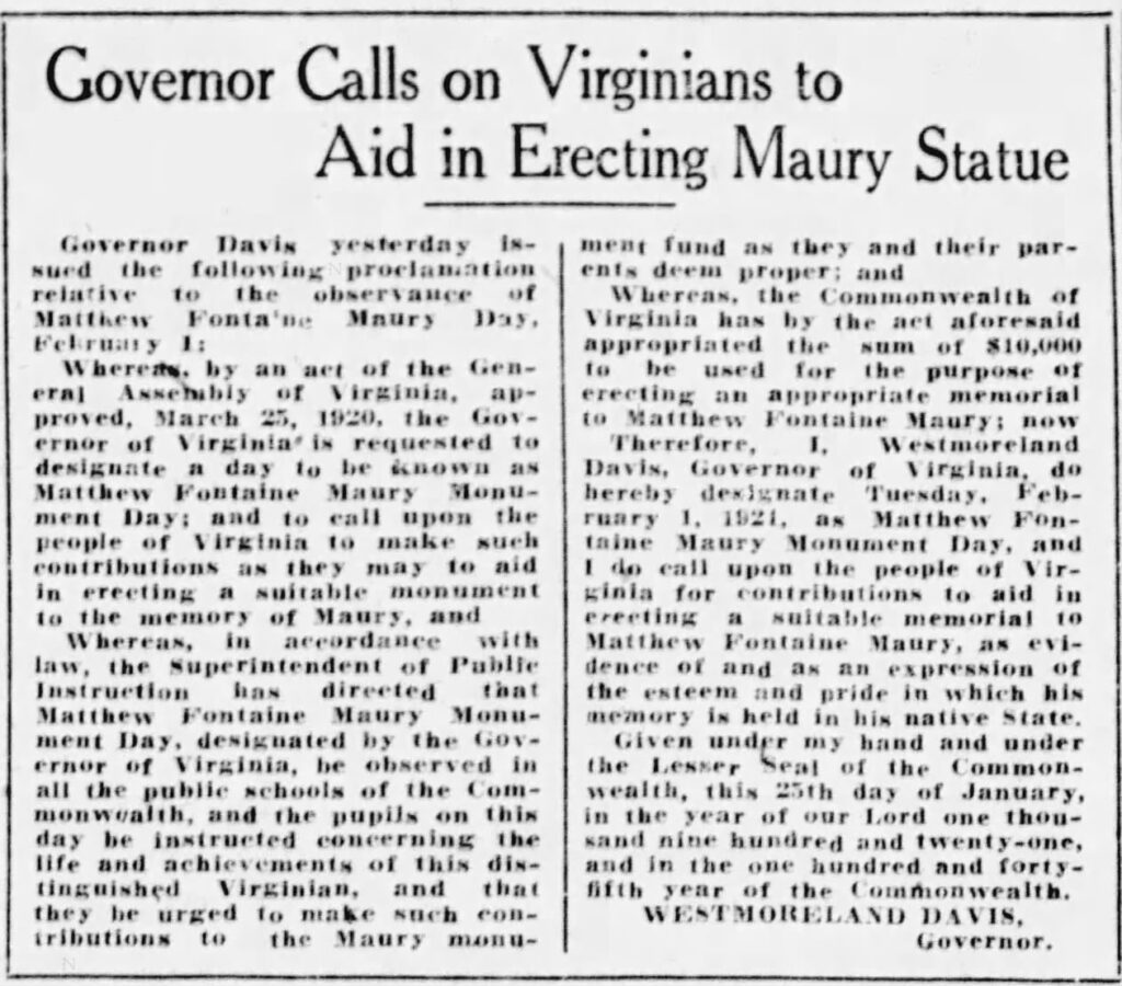 Therefore, I, Westmoreland Davis, Governor of Virginia do hereby designate Tuesday, February 1, 1921, as Matthew Fontaine Maury Monument Day, and I o call upon the people of Virginia for contributions to aid in erecting a suitable memorial to Matthew Fontaine Maury, as evidence of and as an expression of the esteem and pride in which his memory is held in his native State.