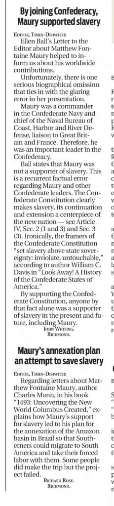 Ellen Ball’s Letter to the Editor about Matthew Fontaine Maury helped to inform us about his worldwide contributions.
