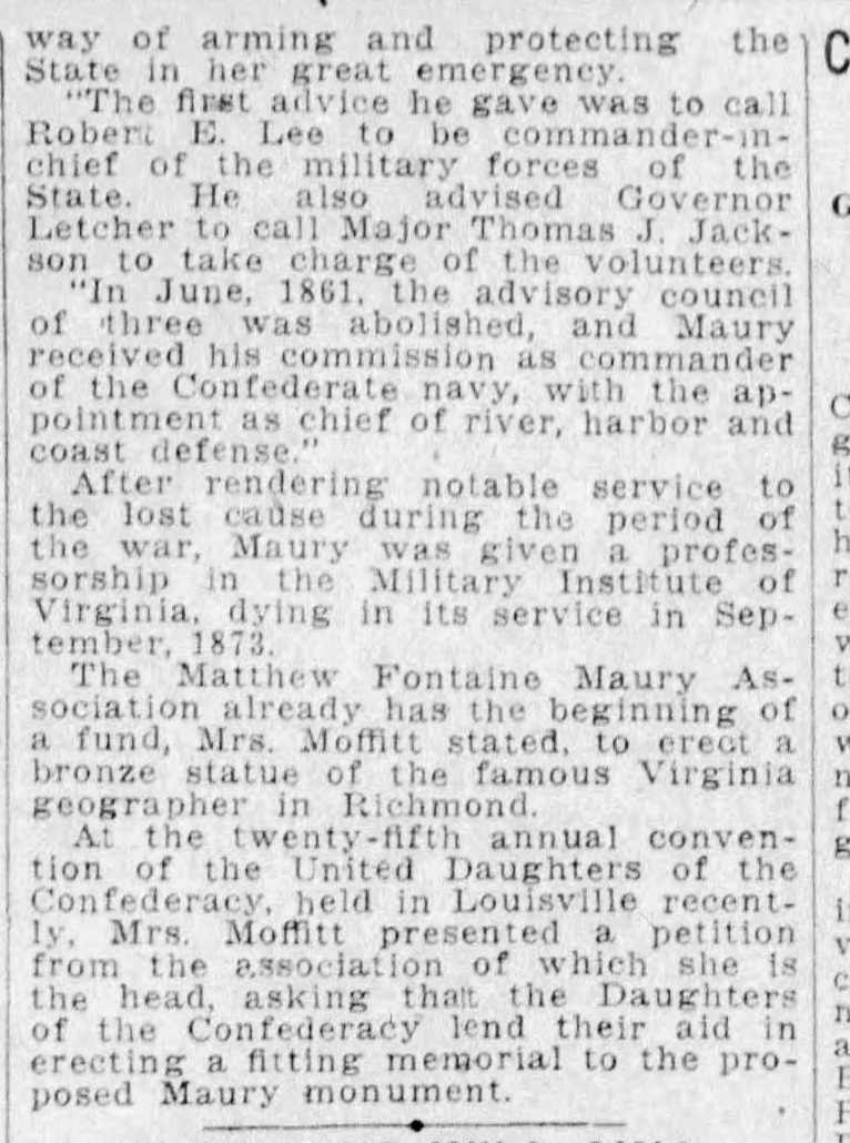 At the twenty-fifth annual convention of the United Daughters of the Confederacy, held in Louisville recently, Mrs. Moffitt presented a petition from the association of which she is the head, asking that the Daughters of the Confederacy lend their aid in erecting a fitting memorial to the proposed Maury monument.