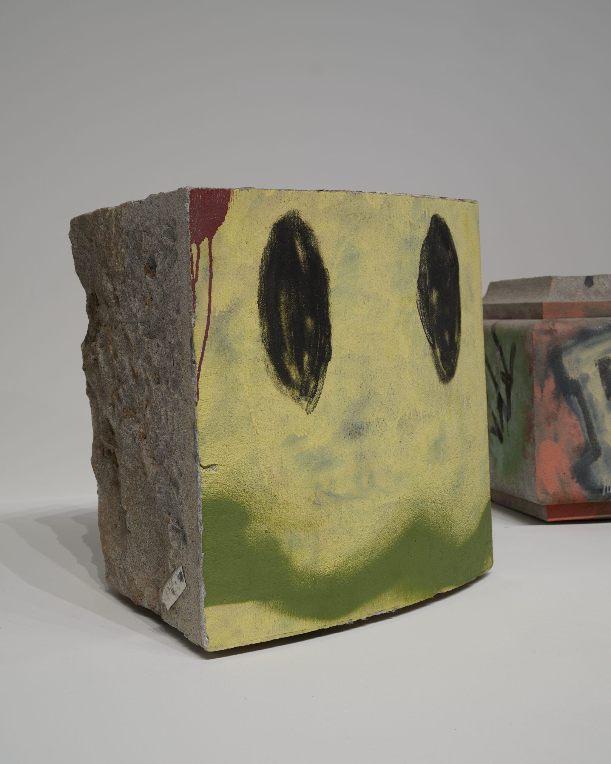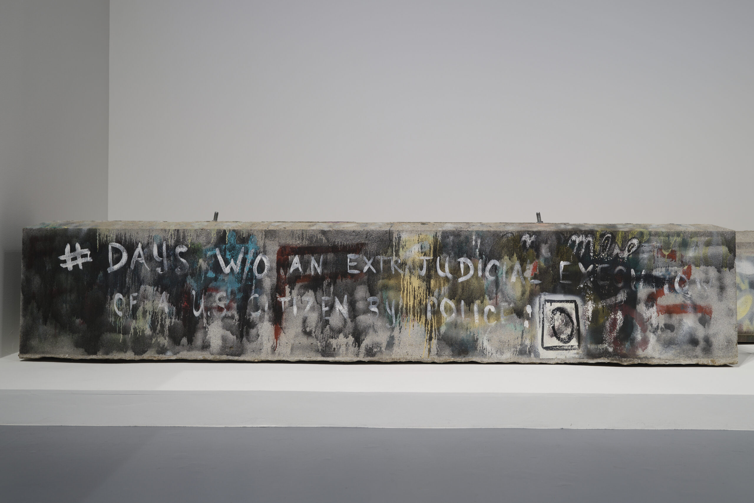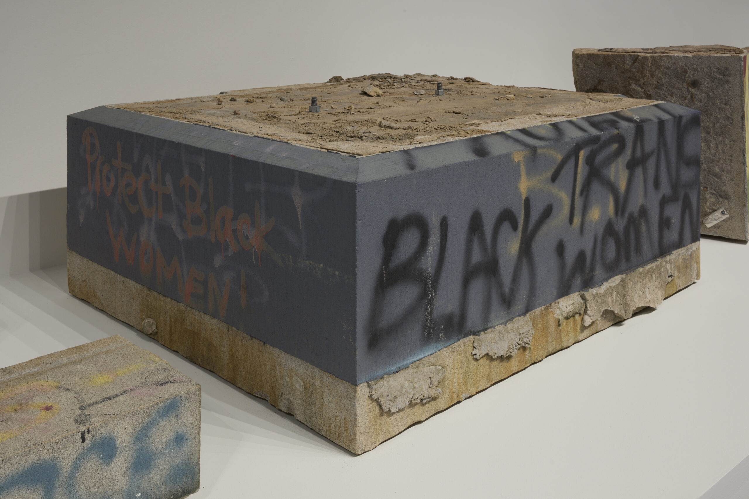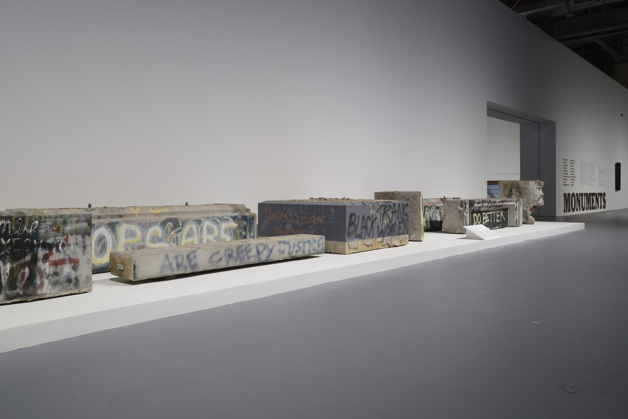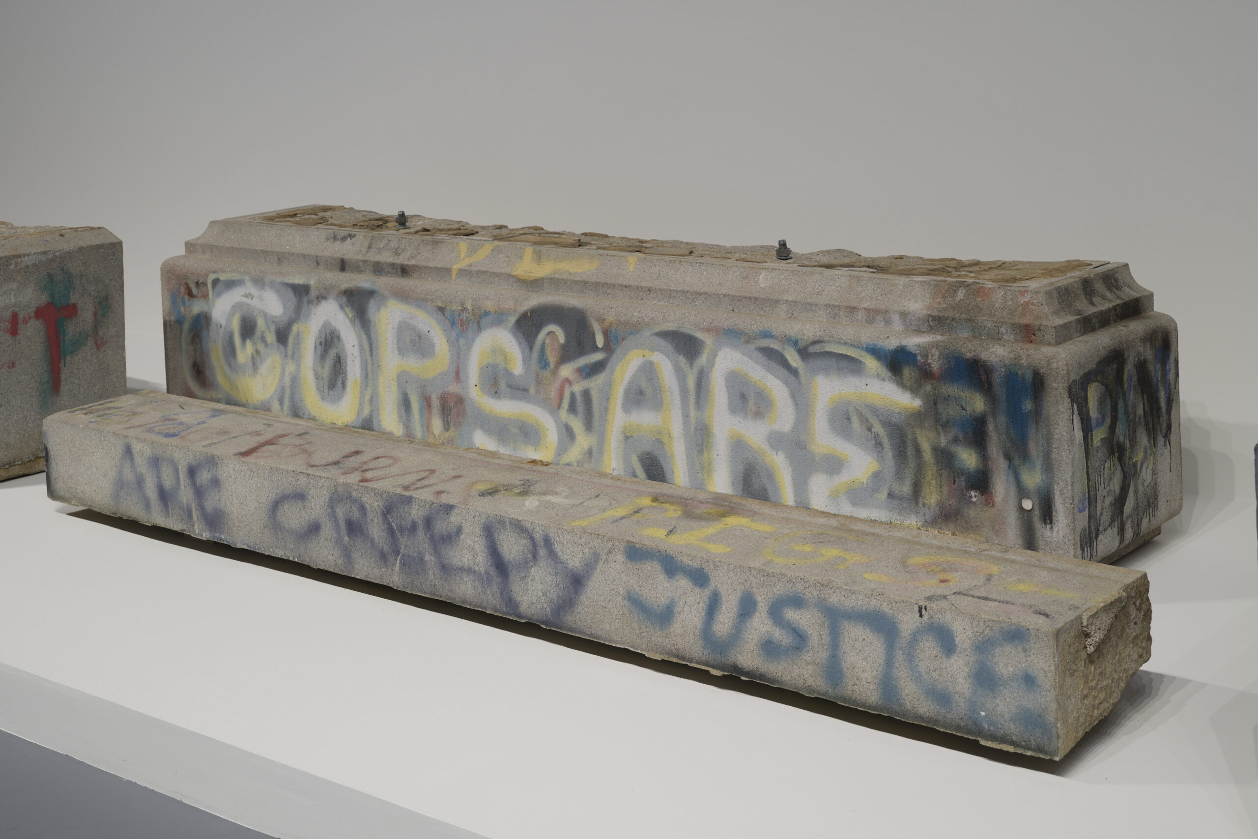 As one of the harder stones used in carving, granite signifies eternity. The Lee base fragments, now spread over the grounds of Richmond’s wastewater treatment plant, recall the archaeological ruins of a structure meant to span generations, to remain in place in perpetuity. The fragments on view in MONUMENTS constitute a record of the activist campaign to nullify Lost Cause monuments and render that intended permanence impermanent. The graffiti on these chunks of stone make visible a public dialogue with the objects once attached to them.