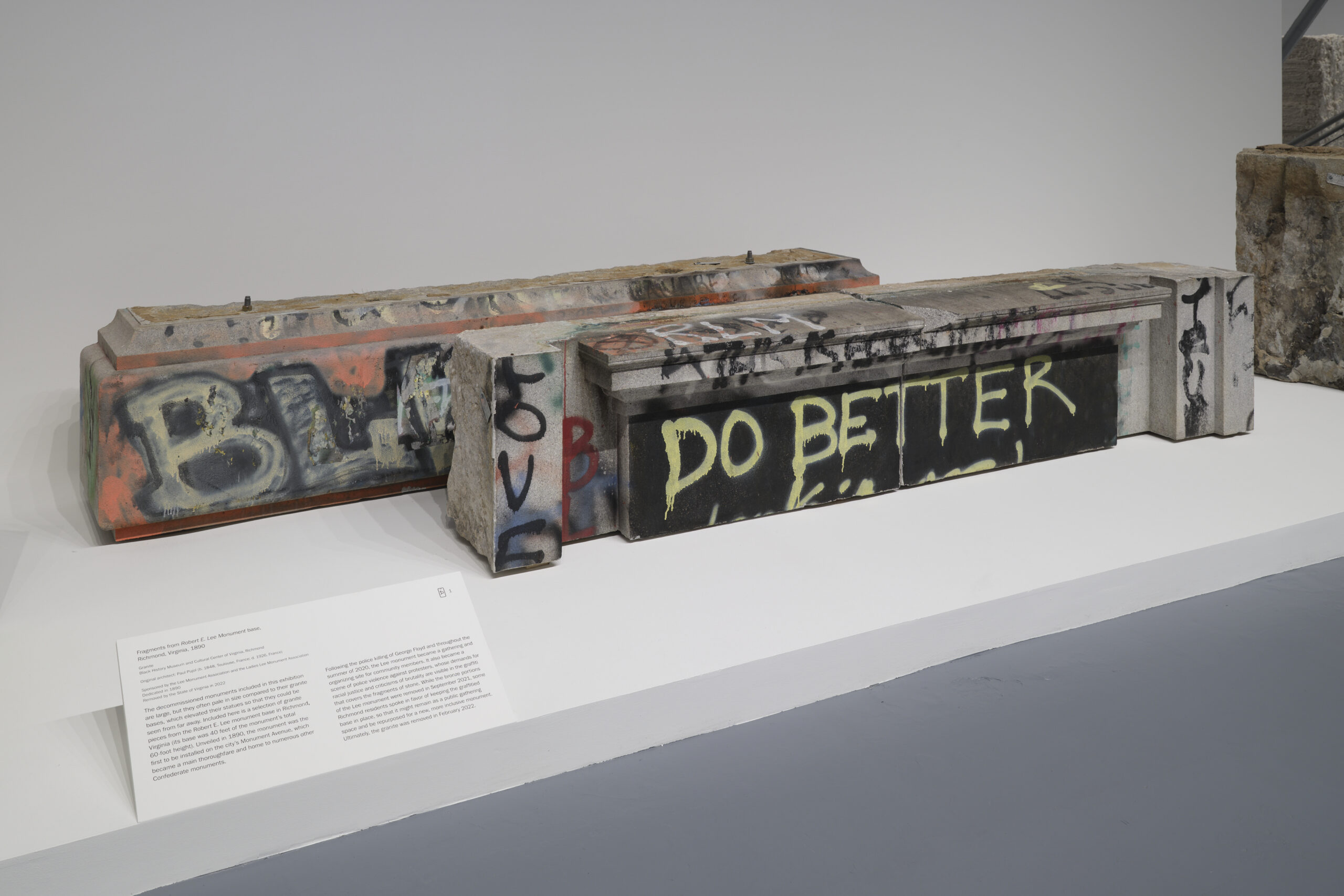 MONUMENTS features a selection of granite pieces that were part of the Robert E. Lee monument base in Richmond, Virginia. The Lee monument, unveiled in 1890, was the first to be installed on Monument Avenue, which was then on the outskirts of the city but became a main thoroughfare and home to numerous other Lost Cause commemorations. The gargantuan stone pedestal stood over 40 feet high and cost $41,500 ($1.6 million in 2024), as compared to $18,000 for the bronze elements ( $730,000 in 2024).