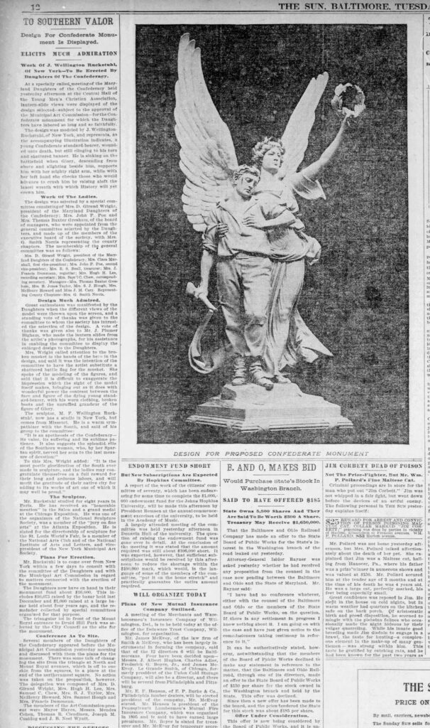 At a specially called meeting of the Maryland Daughters of the Confederacy held yesterday afternoon at the Central Hall of the Young Men’s Christian Association, lantern-slide views were displayed of the design selected – subject to the approval of the Municipal Art Commission – for the Confederate monument for which the Daughters have labored so long and so faithfully.